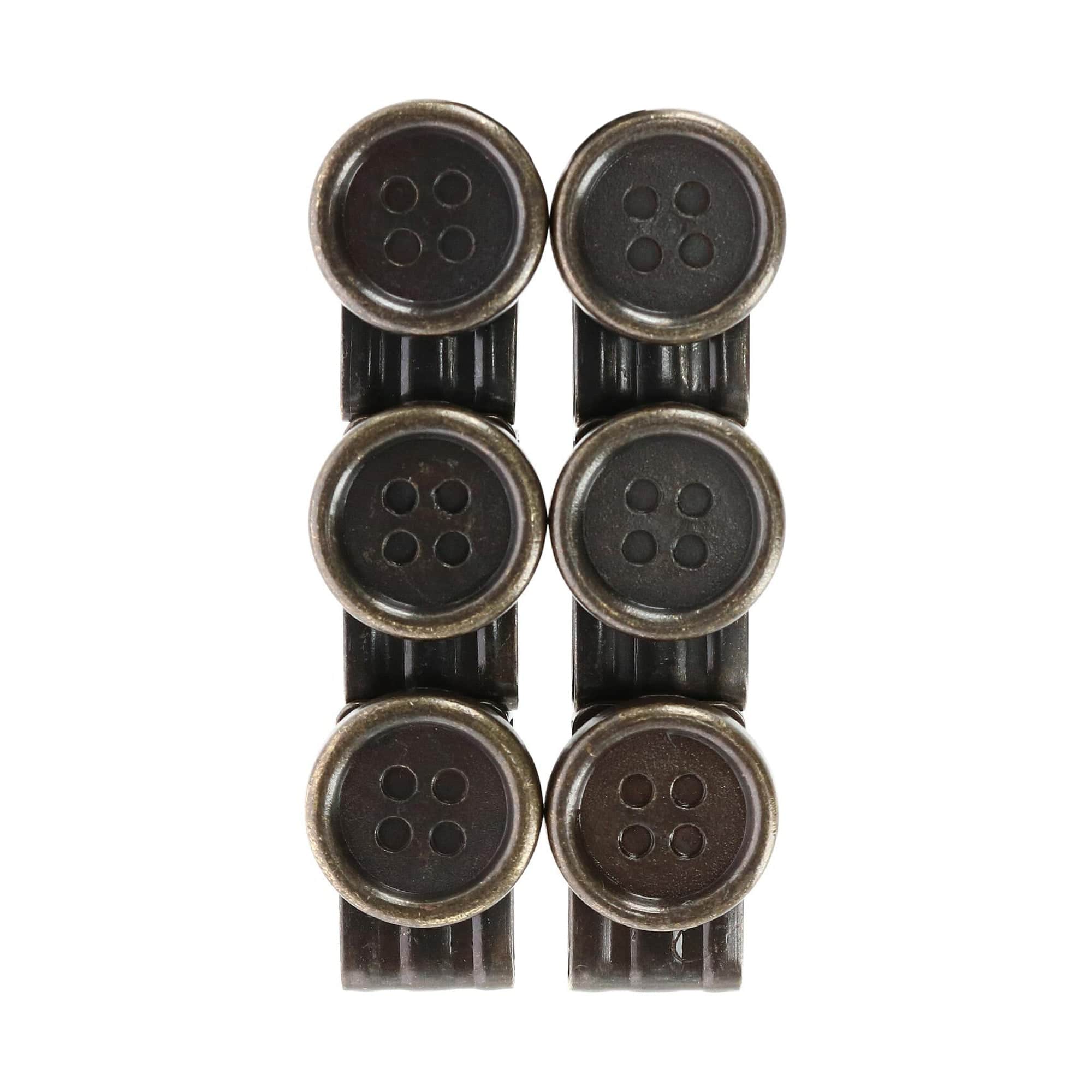 These simple movable button end brace clips eliminate the time and effort of sewing buttons onto your slacks. The set of 6 is one size fits all and easily clips to pants leaving you with no damage. Easily move them from one pair of pants to the next with no sewing required. In order to show off your brace ends, you can put these buttons facing outward, or for a sleek, tucked-in look, you can put them facing inward. Thanks to the metal construction of this product, you can trust it completely. This set of 6 comes in your choice of black, brushed silver, or antique brass moveable button end brace clips.