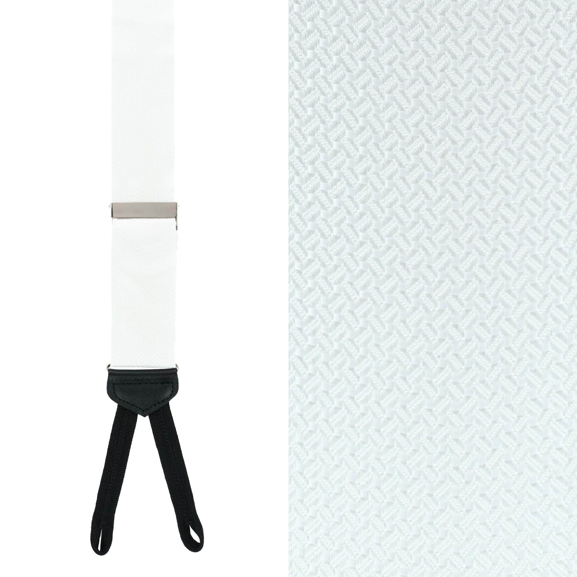 For the gentleman who knows subtlety is key, these formal silk Monte Bello braces are a must-have. The discreet textured interlocking pattern is subdued but makes an impact. Paired with silver tone adjusters and leather tabs, the details in this formal set of braces will add a touch of elegance to any tuxedo or suit. This set even comes complete with 6 buttons to sew into your waistband. Handcrafted in the United States, these formal braces are the sophisticated accessory you need to complete your formal look.